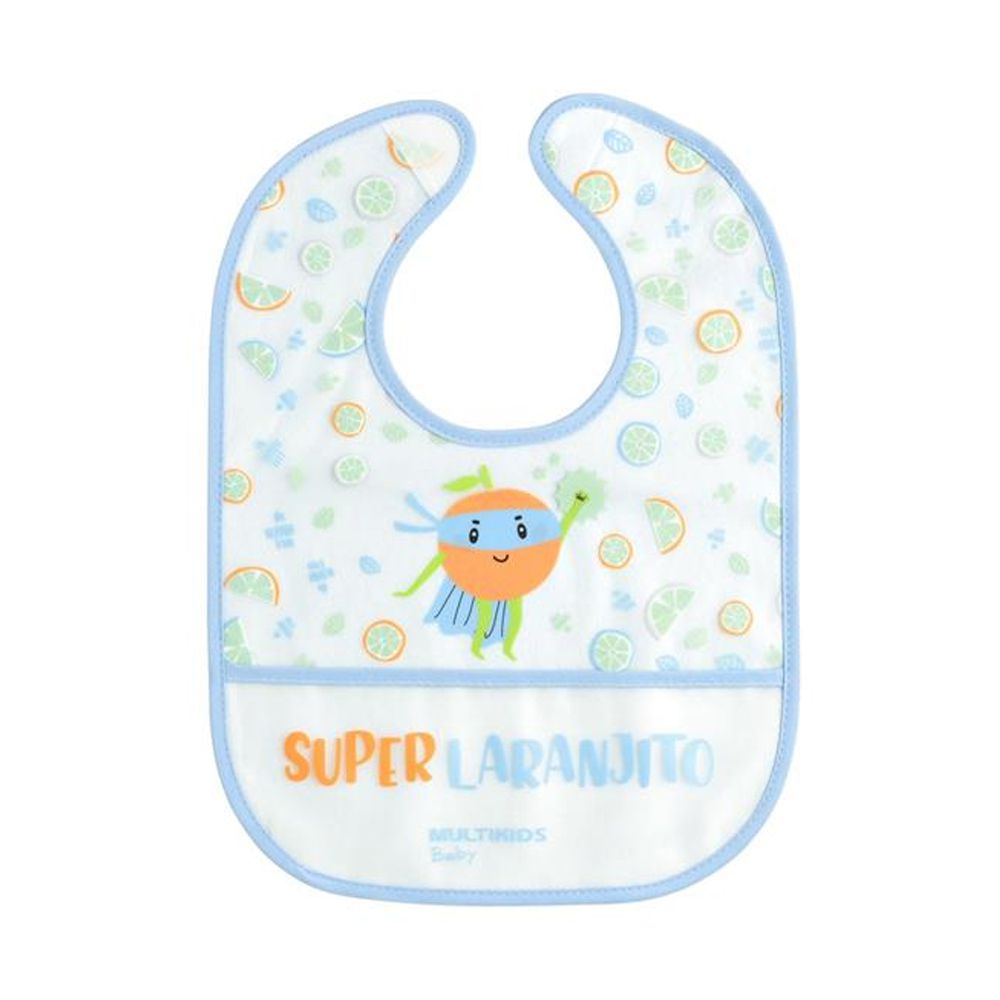 Com estampa colorida e divertida, foi desenvolvido com tecido impermeável e bolso cata-migalhas que permitem que o pequeno se alimente sozinho, evitando sujar a roupinha e facilitando na hora da limpeza.