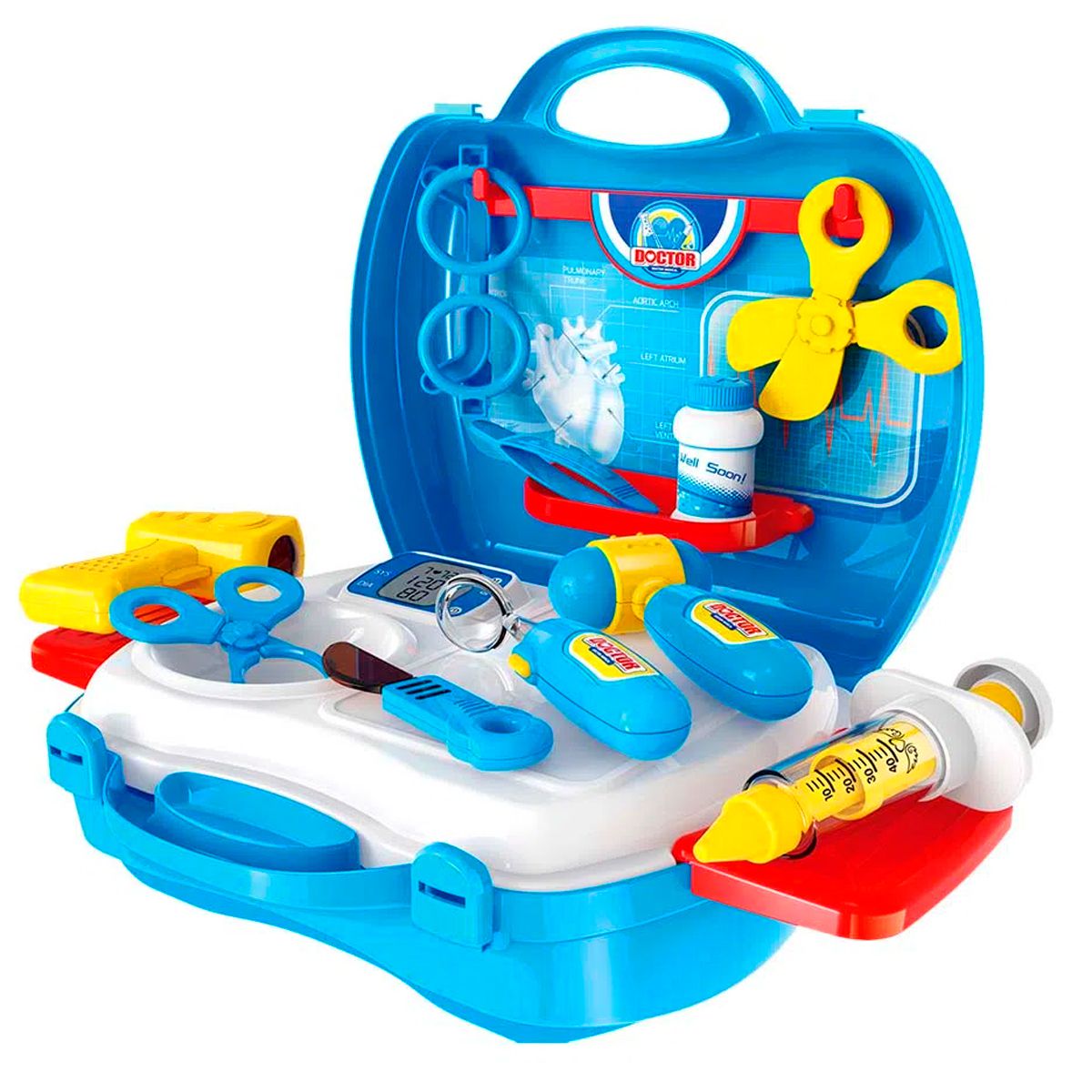 - 1 Maleta Médico Com Acessórios: 8 Adesivos, 5 Suportes, 1 Seringa, 1 Óculos, 1 Bisturi, 1 Pinça, 1 Termômetro e 1 Tesoura.