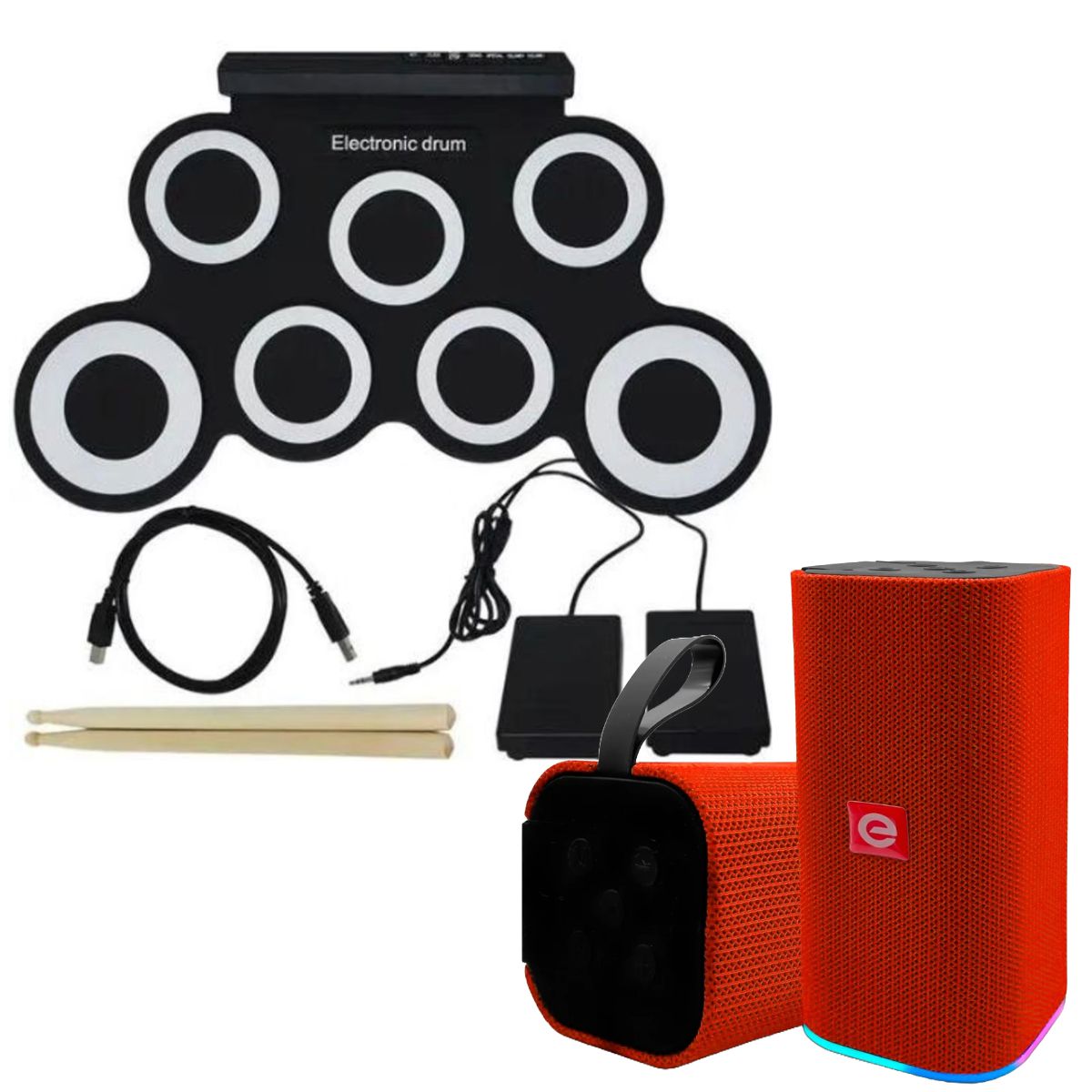 01- Bateria Eletrônica 5 Drums 4 Metal Silicone Portátil C Pedal - Itens inclusos: 1 Bateria Eletrônica, 2 Baqueta, 2 Pedal, 1 Cabo Usb, 1 Cabo P2, 1 Manual (inglês)