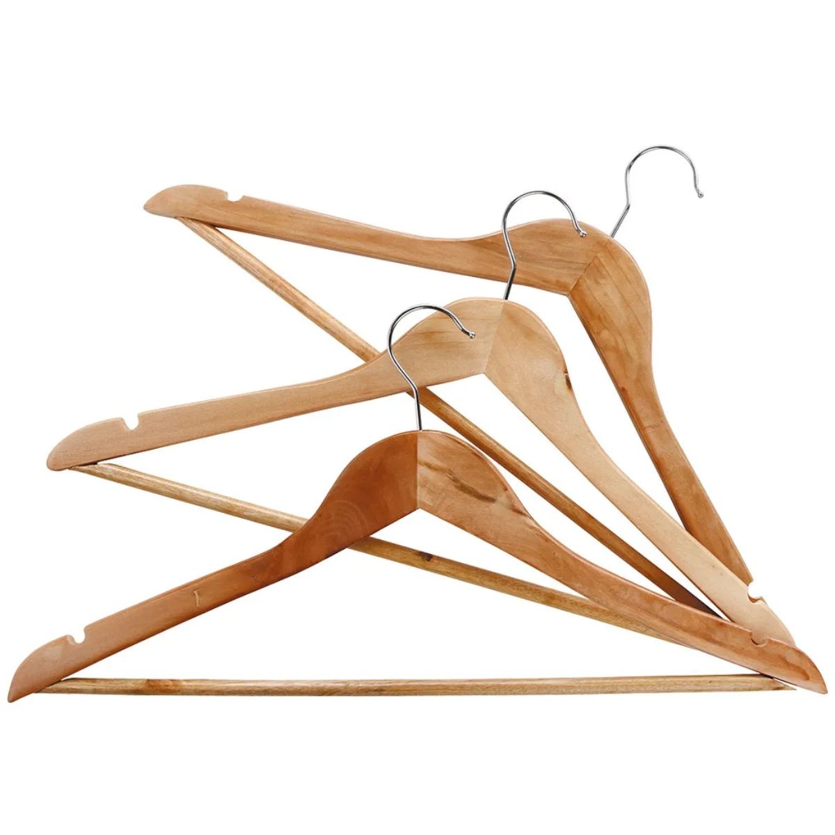Este Conjunto de 3 cabides de madeira vai te proporcionar a arrumação que seu armário estava precisando.