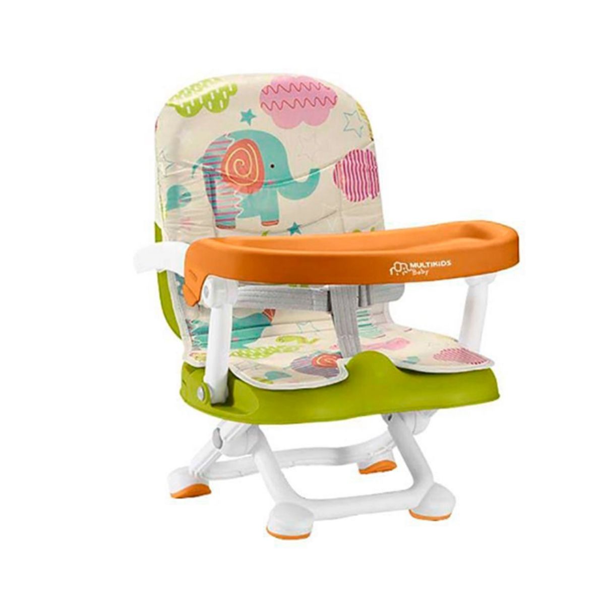 A Cadeira de alimentação é portátil e compacta, possui estofado macio e resistente a água, bandeja removível e cintos reforçados que fixam o encosto e a base da cadeirinha de forma segura, possui 3 posições de ajuste de altura.