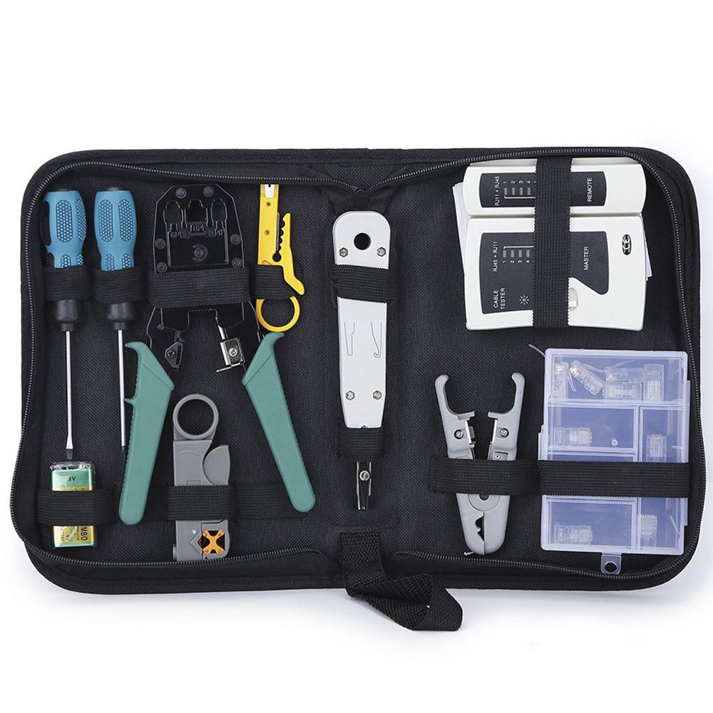 O kit de ferramentas 10-em-1 inclui um alicate de crimpagem, testador de cabo de rede, faca de descascamento de fios, chave de fenda plana/cruz, faca de alicate de decapagem, e conectores RJ45.