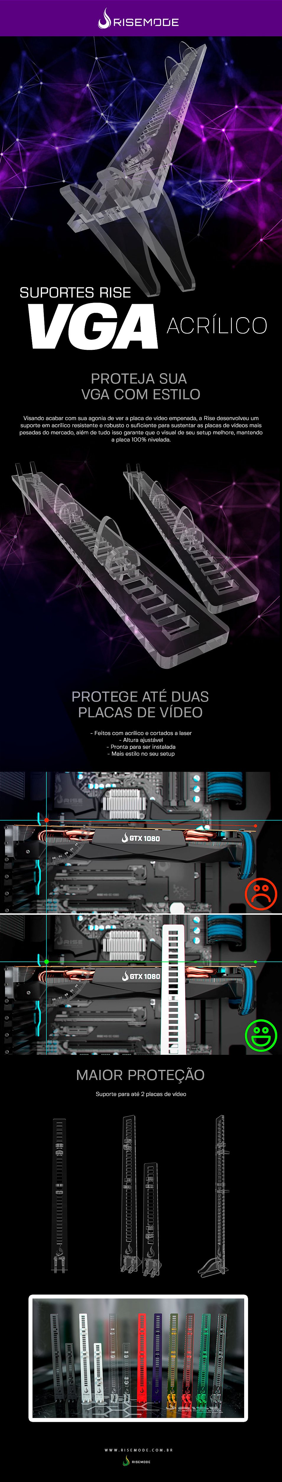 Visando acabar com sua agonia de ver a placa de vídeo empenada, a Rise desenvolveu um suporte em acrílico resistente e robusto o suficiente para sustentar as placas de vídeos mais pesadas do mercado, além de tudo isso garante que o visual de seu setup melhore, mantendo a placa 100% nivelada.
